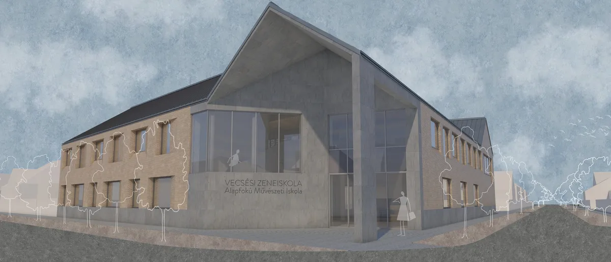 Diplomaprojektem keretein belül egykori zeneiskolámnak terveztem új épületet, mivel a jelenlegi épületet kinőtték, valamint az épületfizikai és funkcionális szempontokból is használhatatlanná vált. A tervezési telek Vecsés központi részén, két forgalmas út kereszteződésében található a városközpont és a lakóövezet határán. Az épület tömegalakításával és anyaghasználatával szerettem volna reagálni erre a kettős környezetre, átmenetet és összeköttetést alkotni régi és új között. A földszinten kaptak helyet a nagycsoportos kamara- és szolfézsórák termei, a tanári részleg, valamint a két szintet lépcsőzetes nézőtérrel összekötő, a koncertekkor elkülöníthető, de alapvetően közösségi térként szolgáló hangversenyterem. A tágas aula teljes hosszában összenyitható a védett belső udvarral, amivel a szabadtéri koncertek és táborok alkalmával fedett-nyitott, átmeneti terek hozhatóak létre. Az emeleten kerültek kialakításra az egyéni- és kiscsoportos órák próbatermei, valamint a zeneiskola és a város zenészei által is régóta hiányolt hangstúdió is. Műszaki megoldásait tekintve igyekeztem a lehető legjobban hasznosítani az épített tereket, mindezt fenntartható és környezettudatos módon. A ház magastetős léte ellenére nincsenek kihasználatlan tetőterek, az emeleti próbatermek teljesen kitöltik az épületburkot, aminek praktikussági és energetikai szempontjai vannak. A keleti és északi utcafrontokra néző termek az oktatás ideje alatt (általában délután) már nem mindig kapnának elég fényt az utca felől, ezért a magastető ellenkező irányba néző nyugati és déli síkjáról délután is elegendő természetes fény jut a leginkább használt terekbe. Ez a megoldás a természetes szellőztetést is megkönnyíti, valamint a téli időszakban a szoláris nyereség növeléséhez is hozzájárul. Anyaghasználatát tekintve a homlokzatokon a hagyományosnak tekinthető téglaburkolat mellett, pontosabban az alatt (annak „alapjaként”) látszóbetonnal találkozhatunk, ami a tégla egyfajta parafrázisa értelmezésem szerint. Ezek a betonfelületek emelik ki az épület bejáratait, valamint a szerelt téglaburkolattal karöltve egy olyan nehéz homlokzatburkolatot alkotnak, amelyek nem csak energetikailag, hőtároló tömegként válnak a ház javára, hanem a funkcióból adód fokozott akusztikai követelményekkel szemben is megállják helyüket. A belső terekben a látszóbeton kendőzetlen határozottságát oldó fa burkolatok és nyílászárók jellennek meg, melyeknek fontos akusztikai szerepe is van.