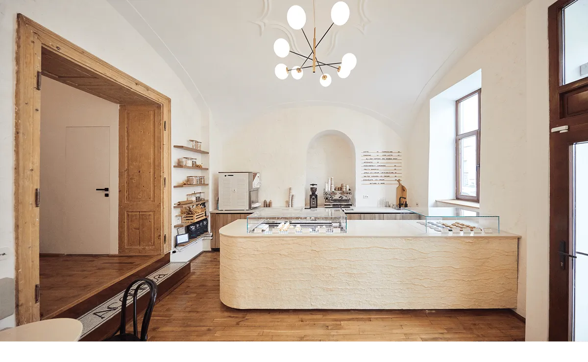 Situată în inima orașului, pe una dintre cele mai vechi străzi ale acestuia, noua cofetărie a beneficiat de câteva detalii arhitecturale care numai în acest context istoric se pot regăsi în forma lor autentică și care toate, împreună, ne-au pus la dispoziție un canvas deosebit pentru noua funcțiune. Zona accesibila clienților e alcătuită din două încăperi unite între ele printr-un gol de usa amplu, pus în evidență de tâmplăria din lemn masiv care îl încadrează, alături de un detaliu foarte special - mozaicul amplasat pe treapta dintre cele doua spații, care conține logoul cofetăriei și care este realizat din nu mai putin de 2000 de piese ceramice așezate una câte una. În prima încăpere, cea cu acces direct din stradă, avem o zonă de servire și tejgheaua cofetăriei, unde am încercat să realizăm un context cât mai neutru, mai luminos și mai liniștit vizual, în care elementul cheie este finisajul aplicat pe pereți - o tencuială tradițională pe bază de var cu fibre de cânepă, care dă nu doar personalitate spațiului, ci și coerență. Tonurile neutre, dar calde, de cremuri și bejuri se continuă și la nivelul finisajelor alese pentru bar, mobilier, tapițerie, pentru a asigura o curgere cât mai fluidă a privirii în interiorul încăperii, având ca focus final produsele expuse în vitrinele minimaliste din sticlă. A doua încăpere adăpostește încă o zonă mică de servire, alături de bucătăria deschisă - aici clienții pot vedea întreg procesul de pregătire a preparatelor servite și pot simți aromele biscuiților proaspăt scoși din cuptor. Tot aici a fost păstrat și un perete pe care au rămas evidente straturile anterioare de tencuiala aplicate, ca o mărturie a istoriei clădirii, adăugând un layer suplimentar de autenticitate spațiului.