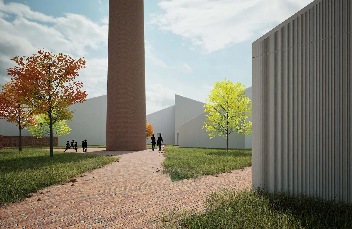 Az építészeti koncepció szerves részét képezi a jelenlegi épületek elemeinek szőnyegként való leterítése a földre, mely a terület épített örökségét szimbolizálja. Ebből a „zöld-tégla szőnyegből” emelkednek ki az új beépítés monolitikus, hófehér tömegei.