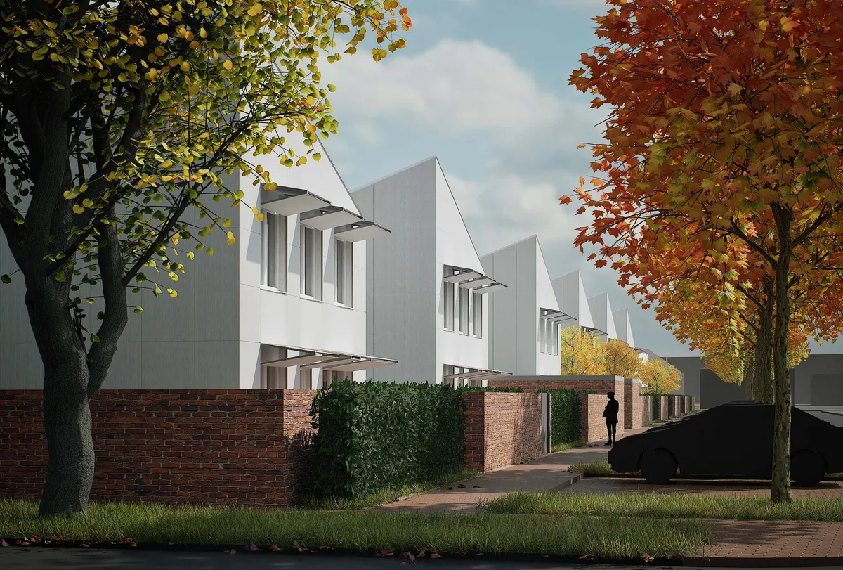 A beépítés nagy része 3 típusú házból áll. A struktúrát meghatározó raszter 9x9 méteres. Az utcavonalhoz igazodik, az északi szélén lévő legforgalmasabb utcánál (Gergely utca) magasabbá és sűrűbbé válik. A beépítés kifelé zárt, befelé fordul, és a tömb belseje felé nyílik, dinamikusan változó belső tereket hozva létre. A két nagyobb teresedés középpontjában a megmaradó elemek állnak. Ezek a terek csak a lakók számára hozzáférhetőek. A házak tömegének váltakozása biztosítja, hogy a privát kertrészek intimek maradjanak. A tetőgeometria célja a kertek és a lakások optimális megvilágításának biztosítása. A homlokzatot a különleges, felfelé nyíló árnyékolók teszik karakteressé, amelyek a homlokzattal megegyező szálcementtel készülnek. A terület autómentes, a parkolás a déli oldalon lévő új utcában történik.
