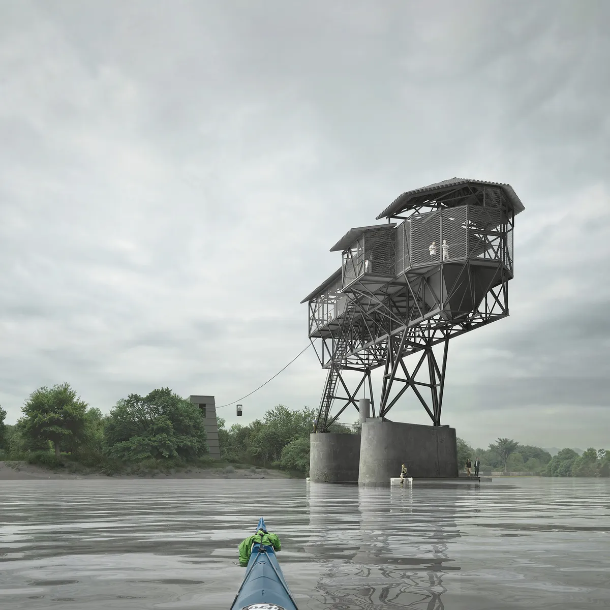 Az épület belső terében helyet kap a kábelkocsi fogadó gépészeti tere és egy személyzeti melegedőtér. A homlokzatra rozsdamentes acél hálót tervezek, amely panorámás kilátást biztosít a Dunára és az Esztergomi Bazilikára. A Rakodó vizuális elszigeteltségét megőrizve, a vízi és szárazföldi megközelítést is elérhetővé tettem.