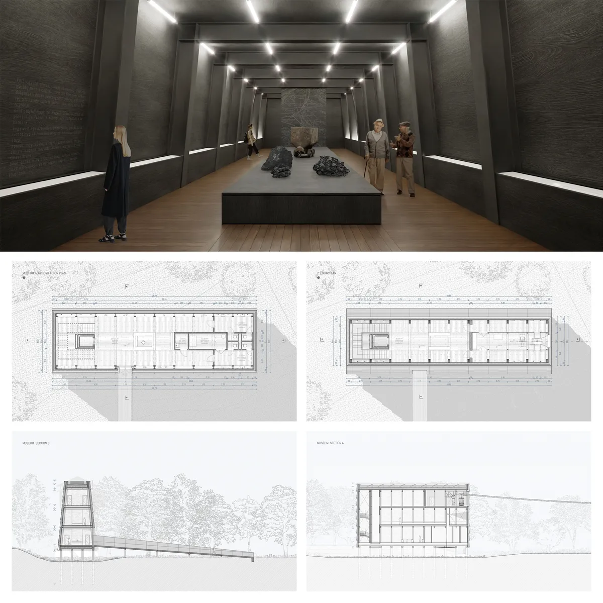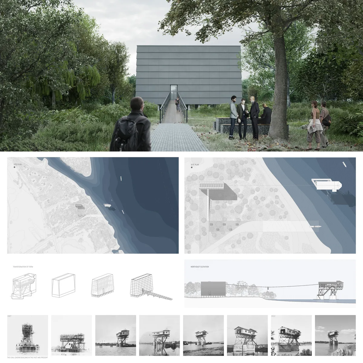 A Szénrakodó mellett egy új épületet, egy Szénbányászati Múzeumot tervezek, amely architektúráját a Rakodóval megegyező vízszintes és horizontális arányokban alakítottam. Az árvízvédelmi szempontokat figyelembe véve emelkedik a mértékadó árvízszint fölé. Az épület nagy keresztmetszetű acél szerkezeti elemekből áll, és sötét színű homlokzati és belsőépítészeti elemekkel rendelkezik.