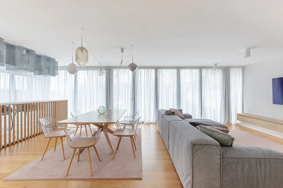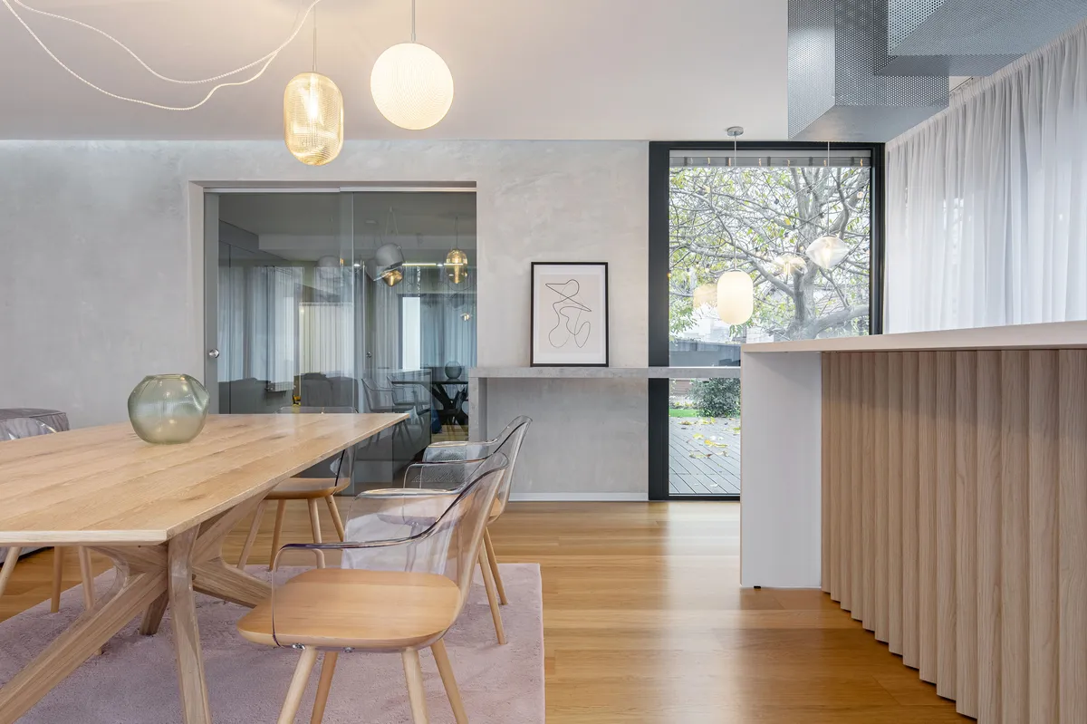 Povestea proiectului a început odată cu dorința beneficiarilor de a extinde locuința existentă. Mare parte din această extindere aparține zonei de zi, având posibilitatea să fie conectată curții, neexploatată anterior. În urma recompatimentarii partea mediană a casei devine un spațiu intermediar și în consecință trebuie să fie permeabilă spațial.Pragurile transparente oferă o percepție amplă a parterului, dar și a profunzimilor curții încă de la intrare. Living-ul este organizat în 3 zone distincte: bar, dinning și o zona lounge, spațiul propune o experiență variată. Paleta cromatică este redată de tonuri calde și deschise, preponderent fiind lemnul. Complementar "elementul" metalic devine diafan odată cu pătrunderea luminii prin perforații. Zona mediană este o combinație de metal și mineral cu nuanțe de gri în care regăsim accente de inox. Dormitorul este spațiul intim ascuns parterului. Aici nu mai predomina rigiditatea materială, ci linia curbă și nuanțele calde.