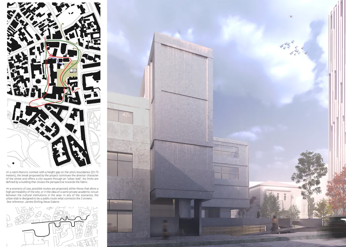 Într-o zona ultra centrala a orașului București, în vecinătatea Căii Victoriei, mai precis pe strada Luterană la numărul 13 se afla fostul punct de vanzare a Garajelor Leonida, o cladire de front, cu o poziție ce formează capăt de perspectiva dinspre Calea Victoriei. Chestionand condiția artistului (studiul, exercitiul, munca, necesitatea de expunere și dialogul dintre colectivitatea artistică și publicul larg), este propus un Centru Cultural Contemporan, într-o zona valoroasa care are capacitatea de a potenta activitatea și comunitatea artistică contribuind în evolutia locului. Situl se află într-un loc semi istoric, cu o evolutie constanta, loc caracterizat mai curand eterogen datorită gabaritelor si a morfologiei pestrite a tesutului. Vecinătatea imediată este una sensibilă, caracterizata de prezenta multor calcane si a unei diferente considerabile de inaltime cuprinsa intre 22m si 75m la Str. Luterana. Ideea proiectului materializează clădirea Garajelor Leonida de pe strada Luterana nr.13 într-o spina ce ține corpurile cu ateliere, spații de lucru, zone de vizionare și experimentare dedicate domeniilor creative din București. Alaturi, se pot dezvolta expoziții, conferințe și proiecții de film Gestul secund vine prin continuarea caracterului alveolar al Străzii cu o pauza ce deschide perspectiva către Biserica Calvina și lăsa o gura de aer fata de turnul de birouri. Aceasta pauza este materializata printr-o “dala urbana” - o piata publică la inaltime oferită orașului. Limitele sale sunt definite de o clădire ridicată care închide perspectiva către țesutul adanc. În acest caz al eterogenității și al tesuturilor urbane adanci, primul gest a venit din dorința de a-l deschide și a creea noi parcursuri. În cadrul unor evenimente se propune ideea unui spațiu permeabil în tesutul urban, iar în restul zilelor, acțiunea ar trebui redusă la un traseu instituțional semi-public pentru studenți. Ideea experimentarii unor astfel de insertii publice în interiorul unei parcele private vine printr-o înțelegere a proiectul lui James Stirling, Neue Galerie cu aplicabilitate pe dala urbana care face legatura dintre str. Luterana și Fundatura Liceului Sf. Sava. Spațiile sunt concepute ca un traseu cu secvențe urbane, din perspectiva celui care privește și explorează întregul centru cultural. Un parcurs care te introduce în diferite etape și deschide vizual secvențe de perspectivă.