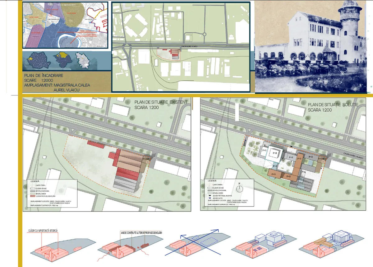 Orice fenomen izvorăste și continua într-un istoric. În acest sens, Centrul de creație al automobilului presupune re-vitalizare functional urbanistică a unei sub-zone industriale din Arad, prin apel la valentele memothenice ale arhitecturii. Miza e de-a prelua istoricul primei fabrici de automobile din România,„Marta" şi de-a oferi posibilitatea de-a crea în prezentul urbei prin conversia şi extinderea functională. Raportându-le la istoria locului şi la opinia comunităţii locale proiectul însumează următoarele categorii funcționale: 1.Spatii muzeale; 2.Spatii pentru studii tehnice. Scopul e de-a oferi spații auxiliare studenților şi pasionaților de inginerie; 3.Spatii pentru publicul larg: spatii expozitionale, alimentație publică şi amenajări. Principiul generator al complexului e unul care urmăreşte cele două axe majore prezente pe sit. Primul ax e cel principal, e vorba de axul care are drept capăt de perspectivă: turnul de apă. Cel de-a doilea ax leagă spațiile amenajate din cadrul amplasamentului cu cele din spatele facultății de inginerie, legând cele două spații verzi. La intersecția celor două axe se află incinta complexului care permite distribuirea către toate categoriile spațiale. Incinta e ridicată al nivelul superior al demi-solului existent al clădirilor istorice, pentru a facilita comunicarea spatială la nivelul parterului. Astfel intenția generală a spațiilor, pe lângă particularitățile destinațiilor asumate, e de-a se deschide dar şi de-a directiona.