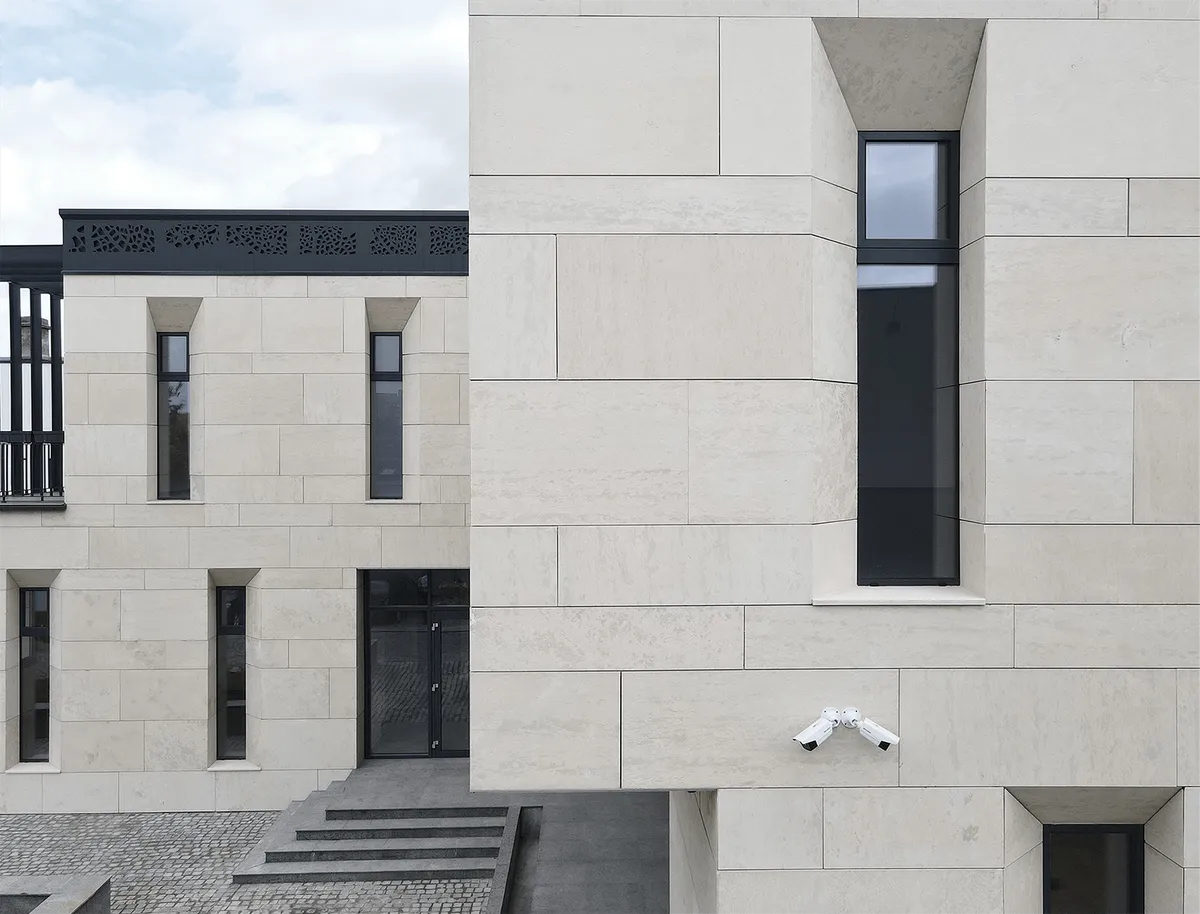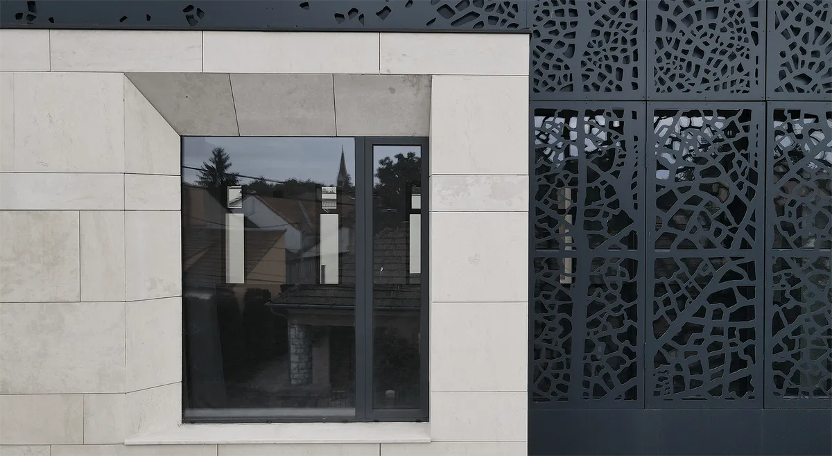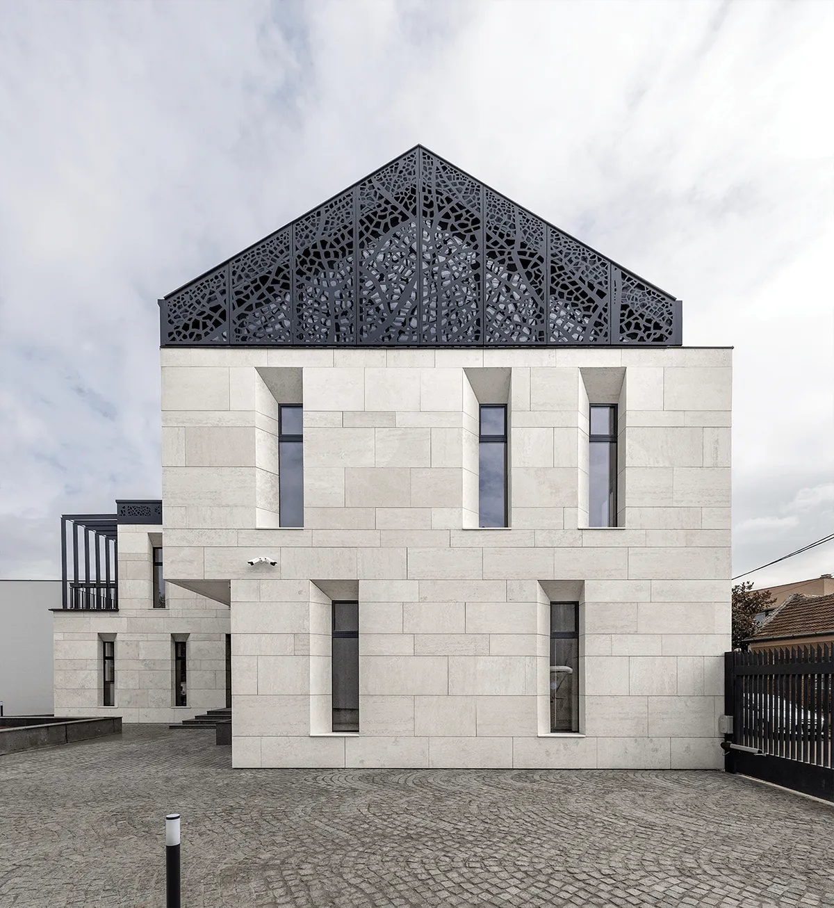 Proiectul propune rezolvarea spațială a unui ansamblu alcătuit din două funcțiuni complementare, una publică și una privată. Propunerea de față constă în crearea unui joc volumetric între două elemente, a unui dialog din care să rezulte spații cu grade diferite de expunere și intimitate. In acest fel nu doar volumul construit spune o poveste, dar și spațiul liber pe care acesta îl delimitează. Corpul A este destinat funcțiunii administrative. La parter regăsim zona de primire și câteva birouri plus grupuri sanitare și oficiu iar la etaj găsim o sală de conferințe, foaier, un birou administrativ și grupurile sanitare. Corpul B are ca funcțiune principală depozitarea. Are o configurație planimetrică similară in forma de „L”, pe ambele niveluri. La ambele niveluri găsim incaperi de depozitare, o cameră de lucru și grupuri sanitare. Încăperile destinate documentelor, fiind dispuse spre sud și vest au ferestre înguste și dispuse oblic în grosime peretelui, pentru a se evita degradarea datorită expunerii directe la soare a documentelor. Piatra de calcar aplicată pe fațadă, tăiată în lastre mari, conferă clădirii un aspect monolitic dând senzația de greutate. Lastrele de piatră de dimensiuni mari, potrivite scării clădirii, și variația desenului pietrelor dau fațadei un aspect natural. Golurile ferestrelor par a fi sculptate în piatră cu lovituri ferme, bine poziționate, raportul de plin-gol al fațadei fiind unul in favoarea primului. Zona vitrata a etajului, ocupată în principal de sala de conferințe si de foaier, este îmbrăcată într-un trafor metalic care contrastează cu piatra albă de calcar. Traforul exterior are rol în controlul însoririi și oferă un grad ridicat de intimitate. Alegerea materialelor de pe fatadă, cât și modelul decupat de pe panourile metalice, fac parte din încercarea noastră de reinterpretare a ‘Artei 1900’ foarte prezentă în Oradea.