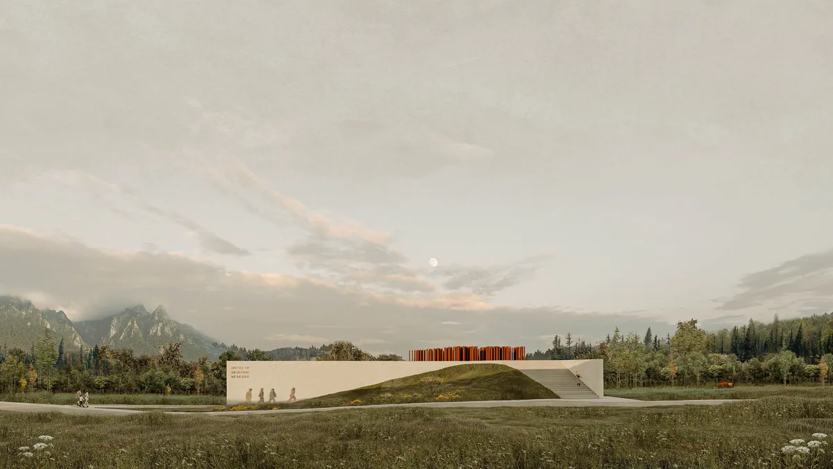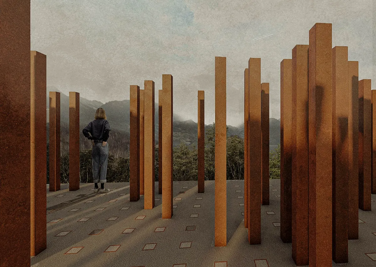 Scopul nostru a fost de la bun început să capturăm esența sacrificiului armatei muntenegrene în luptă. Procesul de design a fost profund înrădăcinat în dialectica acestui eveniment istoric: directiva militară tangibilă de a menține linia și de a câștiga timp pentru aliați contrasta cu actul monumental de sacrificiu și dramaturgiile umane ulterioare. Am urmărit să transmitem rezistența în cea mai pură formă a ei. Simultan, peisajul natural - un deal ondulat, parțial împădurit - cerea un contrast puternic: o formă definitivă stând hotărâtă împotriva fundalului organic, încarnând rezistența și hotărârea. Explorările noastre formale s-au învârtit în jurul acestui joc de contrast. Funcția memorialului a implicat inherent conceptul de timp, reprezentând o călătorie liniară, un pelerinaj. Comemorarea înseamnă în esență procesiune. Am căutat să reinterpretăm și să integrăm elemente care evocau experiențele soldaților în tranșee și reperele care îi îndrumau către pozițiile inamice. Acest concept a influențat expoziția permanentă, pe care am conceput-o ca pe un traseu, reflectând călătoria soldaților. De asemenea, traversarea exterioară a clădirii a fost concepută ca o ascensiune către punctele de observare de pe terasa memorialului, unde soldații din oțel COR-TEN stau într-un tribut solemn.Respectând terenul natural, arhitectura urmează cu grație contururile existente, transformând înclinarea sitului într-un design funcțional și simbolic. Clădirea se desfășoară pe două nivele, armonizându-se cu peisajul natural. Parterul, cu două intrări reminiscente ale liniilor de tranșee, este împărțit în două volume distincte. Volumul principal cuprinde zona de primire, galeria permanentă dedicată Bătăliei de la Mojkovac, facilități sanitare și birouri esențiale pentru personal și curatorii. Acest volum oferă, de asemenea, acces la sala multifuncțională de pe nivelul inferior. Volumul secundar de la parter găzduiește o bibliotecă tematică, un bufet și un magazin de suveniruri, toate deschizându-se către o terasă spațioasă. Nivelul inferior este dedicat unei zone multifuncționale care oferă vederi panoramice exterioare și acces la platforma inferioară. Acest nivel include, de asemenea, o zonă de depozitare și spații tehnice. Terasa clădirii este inima memorialului, accesibilă de pe traseul principal și prezentând o instalare densă de elemente metalice de corten, simbolizând corpul de armată.
