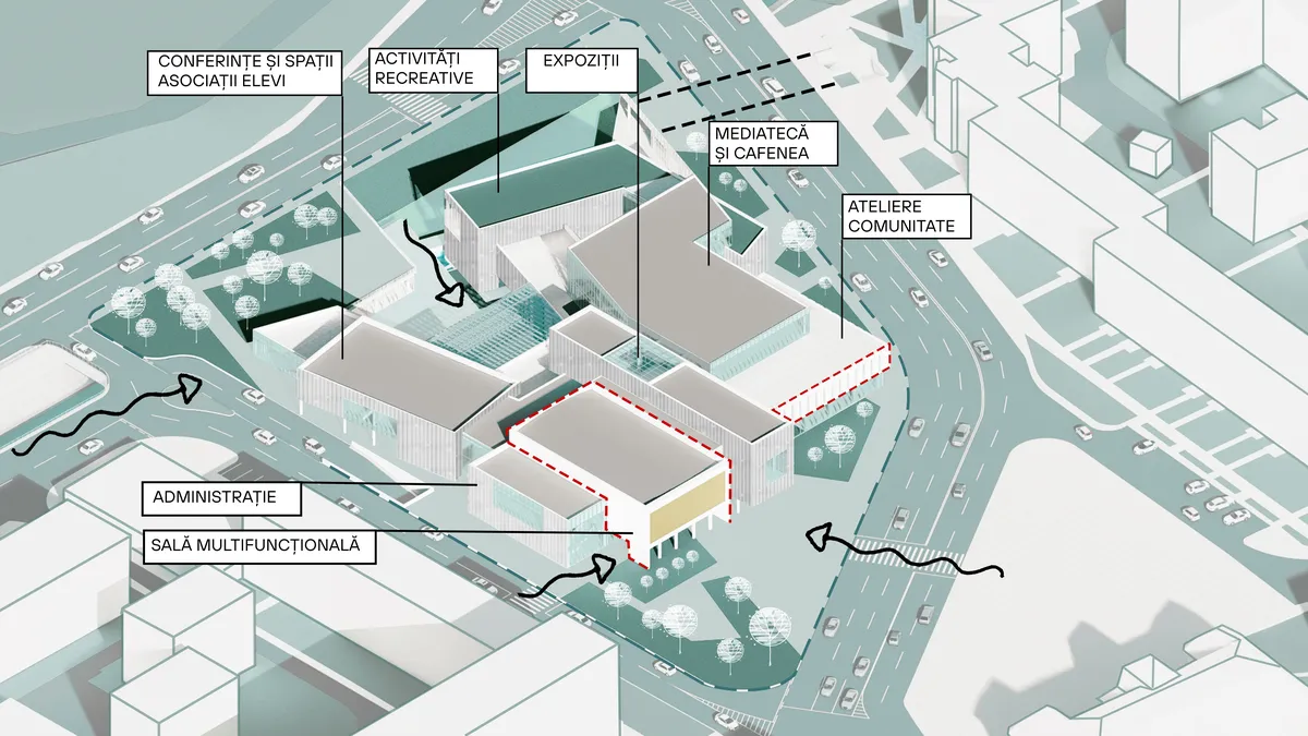 Intervenția proiectului presupune integrarea unei compoziții de volume transparente și translucide în relație cu fondul existent. Compoziția preia diverse direcții ale contexului urban, iar intervenția dorește să amplifice anumite trasee pietonale existente. În cadrul proiectului s-a urmărit valorificarea cotei subsolului, de unde se amplifică relația cu pasajul pietonal subteran existent, dar și relația vizuală cu pârâul Cuejdi. Parcursul pietonal este direcționat către accesul principal printr-un portic generat de volumul fostului cinematograf.