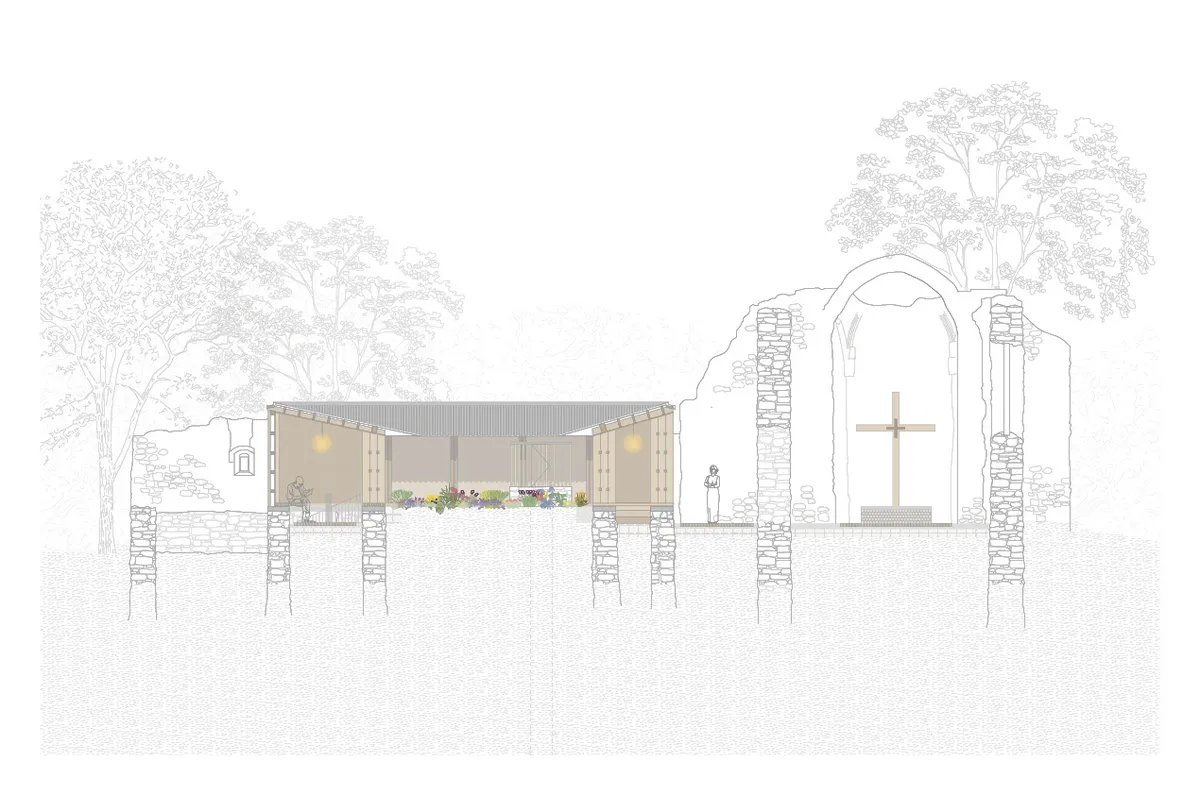 A templomtér magasan megmaradt falainak és az ég és fák koronájának találkozása különösen szép, nem kíván más beavatkozást, mint a hangsúlyának,funkciójának megerősítését. Ezt burkolattal, térbútorokkal és új fa kereszttel adtam meg.