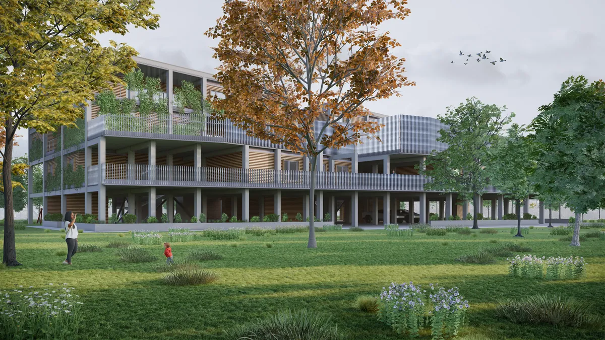Az épületet négy burok határolja. Az első burok a vasbeton váz és egy zöld függöny, mögöttük a fával burkolt lakások CLT-ből, amelyek egy moduláris rendszerből építhetőek fel. Ez fenntartható, flexibilis és zöld megoldást nyújt. A lakók co-living közösséget alkotnak, mint a helyi elődben a Kollektív Házban. Ennek köszönhetően magas minőségű kiegészítő funkciókhoz juthatnak, mint például wellness központ és sport terasz. A harmadik burok a transzparens kerengő, amit „közösségi közlekedőnek” nevezek. Hiszen nem csak a közlekedésre szolgál, munkaállomásokkal és nyitható szerkezetekkel rendelkezik, így keresztbe szellőztethető és a kültéri teraszokkal egybenyitható. Víziómban egy nagy közös nappaliként működik. Az utolsó burok az üvegezett átrium tér, ahol a vertikális közlekedés folyik. Az épület meglévő merevítései és a vasbeton váz szerkezeti elemei látszó, funkcionális belsőépítészeti elemek maradnak.