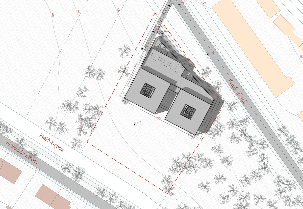 A lakások elhelyezése szigorú szerkesztési szabályok alapján történt, mindegyik kapcsolódik az épület gépészeti aknáihoz. Ennek ellenére kiosztásuk a véletlenszerűséget tükrözi a homlokzaton. A legalsó szinten parkolók és gépészeti helyiségek találhatók, így a természet befuthat a lábakon álló épület alá. Nem a megszokott vázkitöltőfalas megoldást választottam, hanem megtartottam a számos helyi cikkben „rondának” titulált vázat, mint látszó felület. Feladatomnak éreztem megmutatni, hogy ezek a szerkezetek nem rondák, csak egy kis törődést igényelnek. Víziómban a meglévő váz és az új épületszerkezetek együttélése hoz egyedi megjelenést és új fejezetet a magányos váz életében.