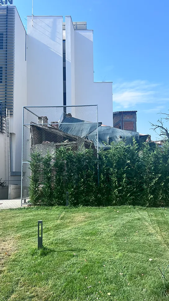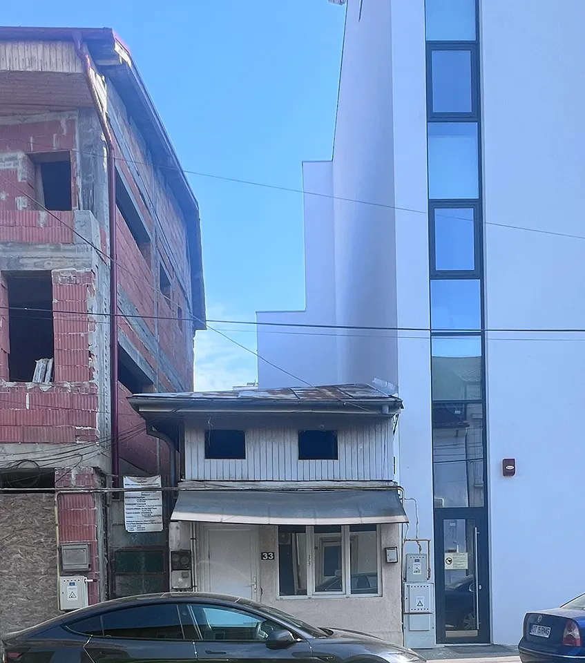 Inserție în țesut disonant Într-un context copleșitor prin complexitatea sa, simplitatea ia forma unui manifest. Noul corp al clinicii de urologie este construit pe un teren de o formă neregulată, cu deschidere la două străzi cu caractere vizibil distincte, ambele marcate de intervenții urbanistice distructive. Evoluția Străzii România Muncitoare a fost afectată în anii ‘80 de ridicarea blocului Luxor, care a izolat segmentului său estic de centrul istoric activ al Craiovei și a accentuat procesul de abandon și degradare al acestei străzi negustorești. În timp ce lărgirea prospectului străzii A.I. Cuza din 2008 a lăsat cicatrici vizibile și astăzi sub forma unui segment cu aliniament nedefinit și aspect general de fund de lot. Dacă pe de o parte există aceste disfuncții, pe de cealaltă parte, în cadrul insulei urbane care găzduiește inserția, cele mai noi construcții anunță prin volumele lor o trecere organică de la casele înguste și joase de secol XIX ale străzii România Muncitoare, la clădirile masive dispuse individual ale străzii A.I. Cuza. Este și cazul corpului vechi al clinicii de urologie. Acesta se încadrează în caracterul străzii negustorești prin alinierea la aliniament și dezvoltarea în adâncimea lotului, dar se aseamănă și cu vecinii săi de pe strada A.I. Cuza prin regimul de înălțime. Extinderea centrului medical ia în calcul atât cerințele specifice funcțiunii cât și complexitatea unui mediului construit rezultat din confluența unor țesuturi urbane contrastante și unor situații urbanistice excepționale. Volum zvelt de tencuială albă, brăzdat de minimumul de fante verticale se conectează la înălțimea mică a vecinătății imediate prin trei trepte înierbate. Iluminarea cabinetelor medicale este asigurată fie direct fie indirect prin curți de lumină. Diversitatea, excesul și disonanța care reies din observațiile personale de la fața locului, studiul istoric, analiza plin-gol și eșantioanele de materialitate au ghidat soluția arhitectură către o imagine a simplității și a curățeniei, atât de potrivită inclusiv funcțiunii pe care o găzduiește.