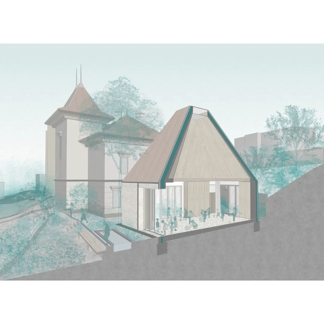 Gyorsuló ütemben fejlődő világunkban a gyermekek mentális egészsége drámaian romlik. A figyelemhiány, az ADHD, az SNI, a szorongás, a depresszió gyakorivá vált. Tervem helyszíne a természetközeli adottságokkal rendelkező Sashegyi Arany János Általános Iskola és Gimnázium, melyet a Notre Dame de Sion apácarend építtetett 1929-ben. A telken álló egykori paplak épülete a tervezett központ főépülete. A paplak lakóépület-jellegéből adódóan hiányzik a nagy, egybenyitott tér, ám az élményterápiához szükség van egy kb. 70 m2 alapterületű csoportteremre. Az épület csupán az említett csoporttérrel bővül, melynek formálását és méretét az épített kert-típusok sokszínűsége határozza meg. A villa emeleti szintjén heyezkednek el a nyugodt egyéni terápiás szobák. A bővítés tömegformálása utal a villaépületre: a lábazati zóna kiterjesztésével jelenik meg az új tömeg; a kontyolt tetőszerkezetű, aszimmetrikus formálású, tetőbevilágítőval rendelkező „kupola” nyújt biztonságot a teremben tartózkodóknak.