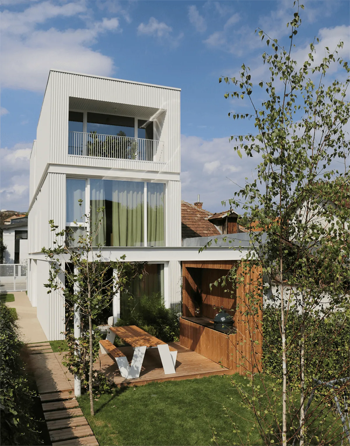 Casa 4 se află în apropierea străzii Metalului, zonă care face trecerea dintre o zonă industrială și o zonă rezidențială în partea nordică a orașului Cluj Napoca. Parcela de 240 mp are o formă alungită, cu front îngust și este mărginită de două locuințe și două ateliere. Proiectul a presupus extinderea și etajarea clădirii existente , care să genereze o arhitectură integrată, care să exprime și să preia din formele, memoria și istoria locului în curs de restructurare. Casa este structurată pe trei niveluri, registre bine exprimate și în arhitectura exterioara. Exteriorul este placat cu tablă, dând locuinței un aspect industrial într-o notă contemporană. Suprafețele mari vitrate, strategic amplasate, sunt o caracteristică puternică a casei permițând luminii naturale să invadeze spațiile interioare, să creeze o atmosferă deschisă, generoasă și să ofere o comunicare puternică cu curtea exterioară si împrejurimile. Aceste vitraje fac deasemenea ca spațiile interioare să fie totuna cu spațiile exterioare, nesimțind că locuiești probabil în cea mai îngustă casă din oraș. Fiind o locuință de arhitecți, majoritatea sistemelor sunt inovative , eficiente , de la structura minimalistă a casei până la finisaje de beton aparent, cu agregate expuse și la sistemul inovativ de fațadă ventilată. Designul este minimalist și eficient, folosind fiecare metru pătrat. în interior vei găsi un spațiu deschis care conectează pe orizontală întreaga zonă de zi cu exteriorul, dar și pe verticală cu etajul superior, prin poziționarea unui gol deasupra bucătăriei, în inima casei. în acest fel casa conectează majoritatea spațiilor interioare oferind deasemenea o comunicare directă și facilă între membrii familiei. în ciuda terenului îngust casa a fost gândită a.i. să ofere suficient spațiu pentru toate nevoile unei familii cu patru membri. În exterior se află o curte restrânsă ,bogată în vegetație, aflată într-o conexiune intimă și relaxantă cu interiorul. În concluzie această casă pe teren îngust cu vitraje generoase și anvelopă metalică este ca o sculptură metalică izbitoare și contemporană. Designul său maximizează spațiul, lumina naturală, funcționalitatea , creând un mediu de locuit confortabil, impresionant, înconjurat de spații verzi.