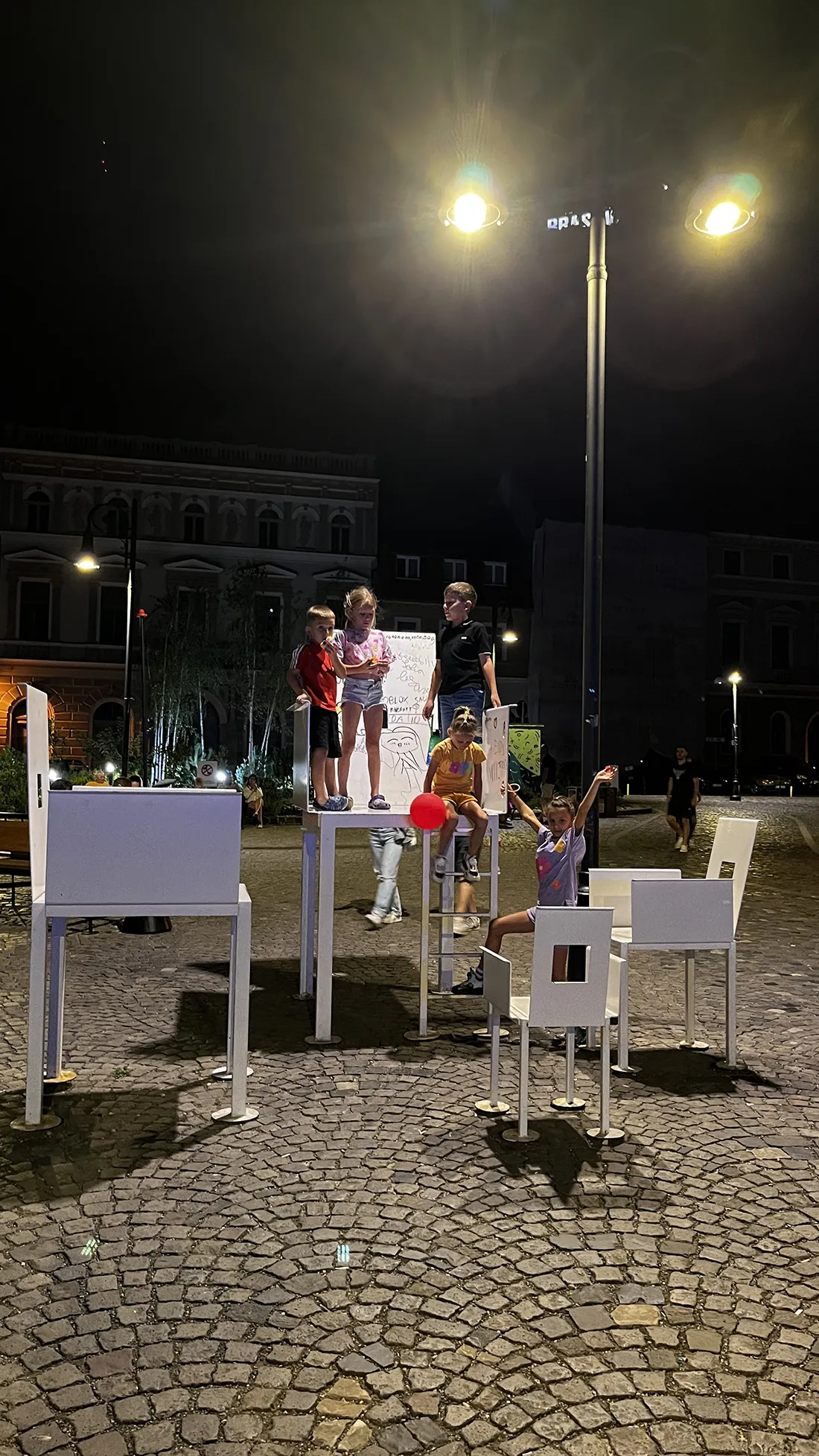 În Centrul Istoric al Brașovului sunt cca. 4000 de locuri de stat jos la terase și în jur de 200 de locuri publice de stat jos, așezate pe unde a mai rămas loc. „Jocul Urban” este un ansamblu de 5 scaune de diferite mărimi, amplasate în același Centrul Istoric. Este un loc de joacă camuflat în instalație de artă și o ironie fină la adresa privatizării excesive cu terase a domeniului public. Cel mai mic dintre cele 5 obiecte are dimensiunea unui scaun de copil și este probabil singura piesă de mobilier urban, adresată celor mici, din zonă. Cel mai mare dintre scaune are puțin peste 2.5 m înălțime și este, pentru un om mare, ceea ce e un scaun obișnuit pentru un copil de trei ani – un pretext de joacă și un obiect deschis interpretării. Iată deci și întrebarea de cercetare a proiectului (reamintim că am vrut să fim ironici): ce putem face, de fapt cu un scaun? ”Jocul Urban” este și un exercițiu de design. Modificând scara scaunului am provocat o discuție în jurul său ca obiect. În loc de concept am citit și dezbătut textul lui Eric McLuhan despre cauzalitatea formală a lui Aristotel, ne-am întrebat care este schița primară a scaunului, forma lui cea mai schematică. Pentru a putea dezvolta o înțelegere formală a scaunului ca obiect, am analizat 10 scaune reprezentative pentru diferite epoci. Fiecare scaun a fost abstractizat, astfel încât să fie reprezentate doar liniile sale esențiale. În urma abstractizării tuturor scaunelor, câte un grid a fost construit în jurul fiecărei scheme. Prin suprapunerea tuturor grid urilor a rezultat un loc comun al scaunelor studiate. Gridul căutat nu este echivalentul unui desen de patent de tipul celor în care sunt indicate diferitele unghiuri ale șezutului și spătarului, Nu am urmărit limitele care ii permit scaunului să fie eficient în utilizare. Gridul nu își propune să descrie o serie de posibilități ergonomice sau utilități. Dacă desenul de patent are ca efect apariția unei varietăți formale de scaune prin flexibilitatea pe care o permite, grid ul nostru dorește să prăbușească toate aceste variante într-o formă care pare să spună: „ utilitatea precisă nu este importantă aici, ci ideea de scaun”. Având în vedere cele de mai sus, ne-am bucurat teribil când am descoperit că într-una dintre clădirile alăturate funcționează o grădiniță. De aproape doi ani, copiii se joacă pe scaune în fiecare zi.
