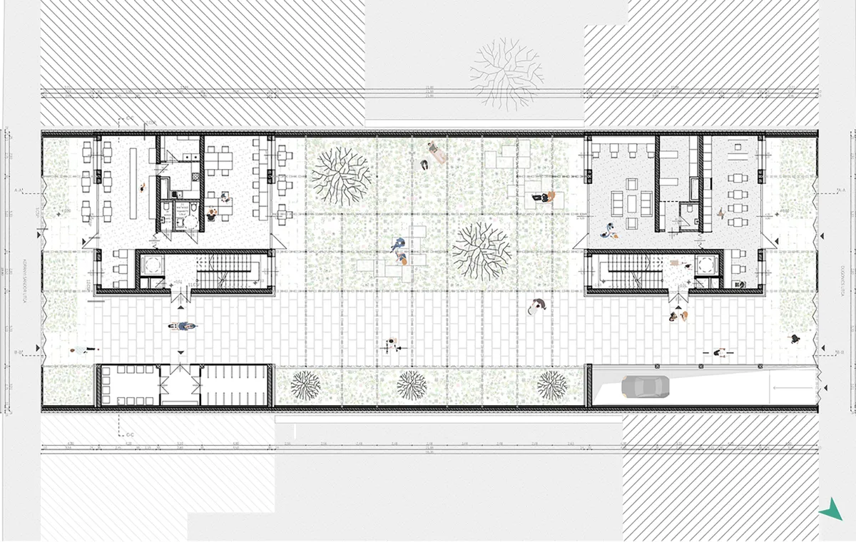 A telek legértékesebb elemének tartom a két utca felé nyitást, két irányból megközelíthetőségét, valamint az átjárhatóság lehetősége izgalmas téri szituációkat teremt.