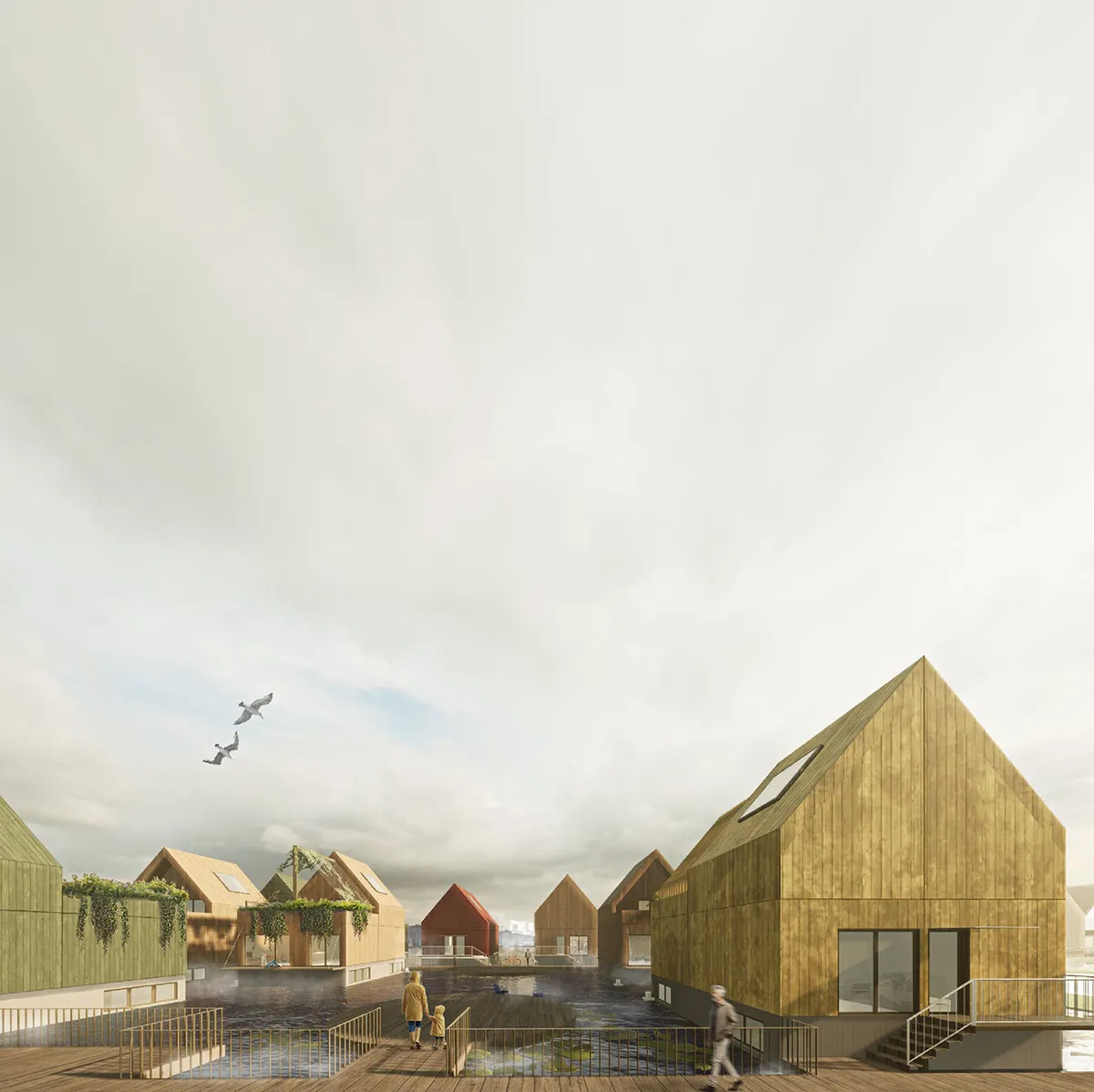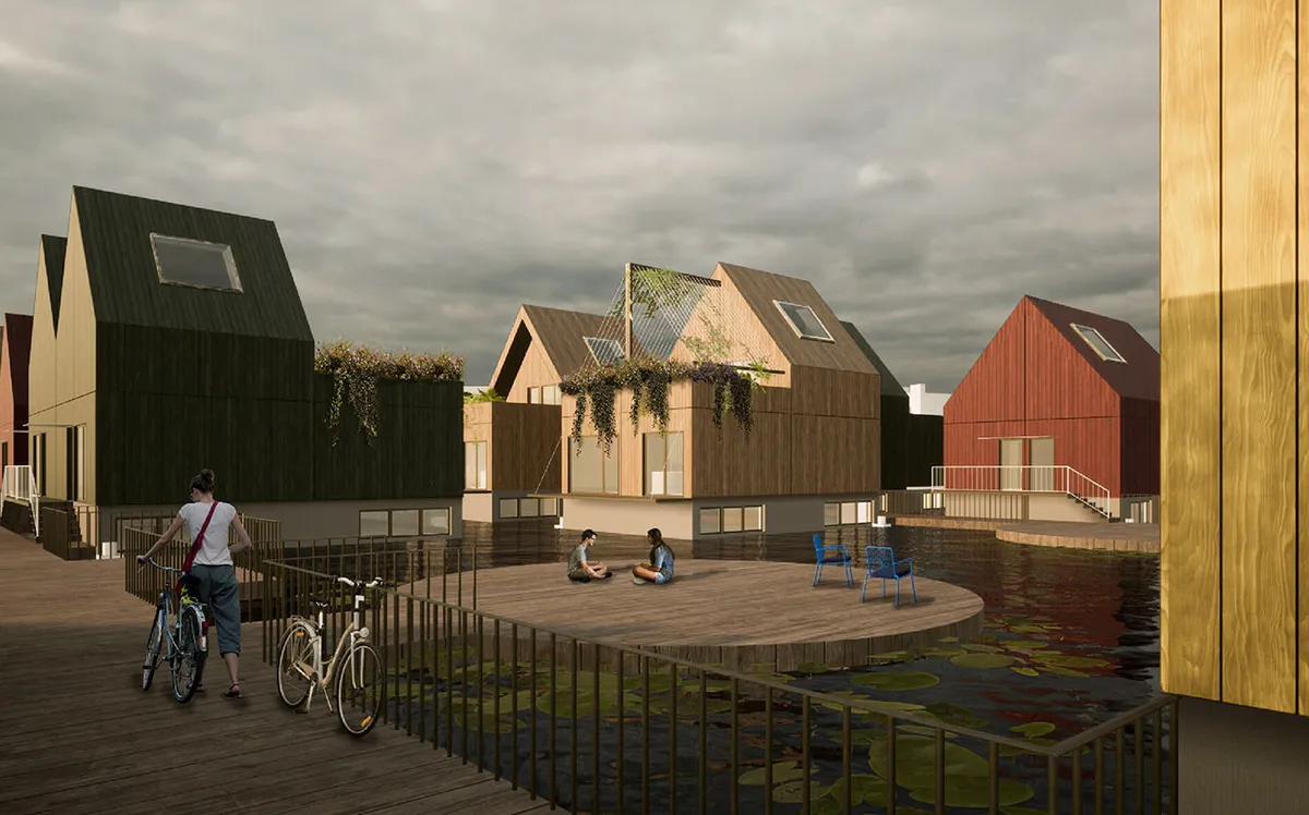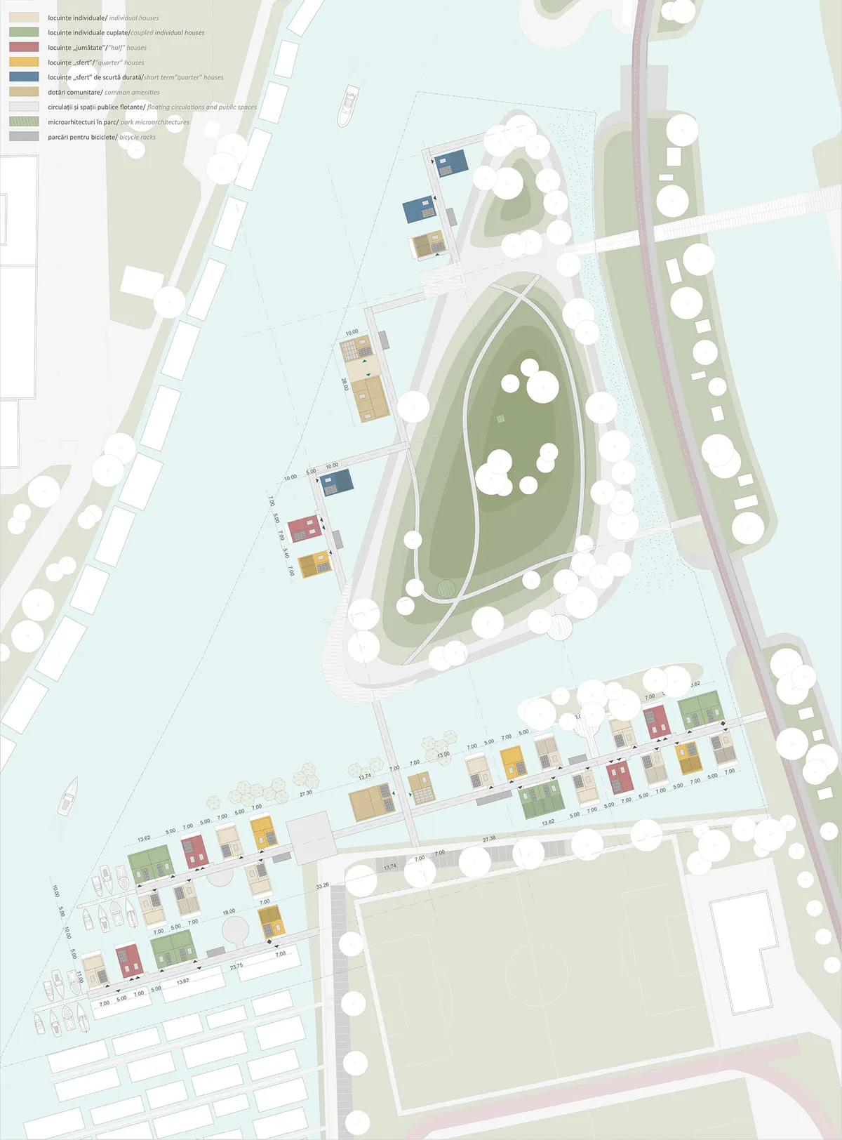 Problematica proiectului de diplomă își are rădăcinile în contextul mai larg, global amenințat de creșterea nivelului mării cauzată de schimbările climatice. Reacționează în consecință pericolelor cu care ne confruntăm în prezent, dar și anticipează un scenariu viitor prin căutarea unor soluții sustenabile și inovative, ca alternativă a modelelor existente de locuire, atât prin modul de organizare cât și prin morfologie și localizare: pe apă, element atât de specific Olandei și mai mult, a orașului Amsterdam. Acesta s-a născut mulțumită proximității apei și a evoluat modelat de apă. Nevoia de locuințe este acută, spațiul este limitat și amenințarea apei este iminentă, astfel proiectul propune un ansamblu din mai multe componente: locuințe de diferite tipuri și dotări pentru comunitate. Locuirea ca și program de sine stătător nu implică în mod obligatoriu și formarea unei comunități. Este nevoie și de alte câteva ingrediente pentru constituirea acesteia: modul de implementare a noii așezări prin propunerea unui model de locuințe în cooperativă și prin aducerea de spații auxiliare locuirii cu rol de catalizator al comunității: dotările comunitare ca spațiu de întâlnire. Locuințele de mai multe tipuri: locuințe individuale, locuințe individuale cuplate, locuințe „jumătate” și locuințe „sfert” formate prin subîmpărțirea unității principale cu suprafața de 7 x 10 m. Aceste configurări sunt menite să satisfacă posibilitățile și cerințele cât mai multor tipuri și categorii de indivizi, luând în considerare situația actuală a locuirii în marile aglomerări urbane, în special în cazul tinerilor, nevoiți să apeleze la închirierea unei singure camere dintr-un apartament cu mai multe dormitoare. Astfel proiectul propune și o categorie de locuințe experimentale cu dormitoare private și spații comune de petrecere a timpului liber. Ele sunt completate de o „bibliotecă” de jucării, o clădire de ateliere și studiouri, un centru de cercetare al biodiversității acvatice împreună cu un spațiu de lucru și spații pentru închiriat, dar și de locuințe de scurtă durată. Ca mod de implementare a tuturor elementelor se abordează utilizarea modulelor. Astfel se eficientizează modul în care sunt transportate elementele ce alcătuiesc ansamblul și pot fi respectate ambițiile de sustenabilitate în ceea ce privește materialele utilizate. Folosirea modulelor dă o flexibilitate controlată în care utilizatorii își pot aduce aportul în procesul de implementare prin configurații diverse.