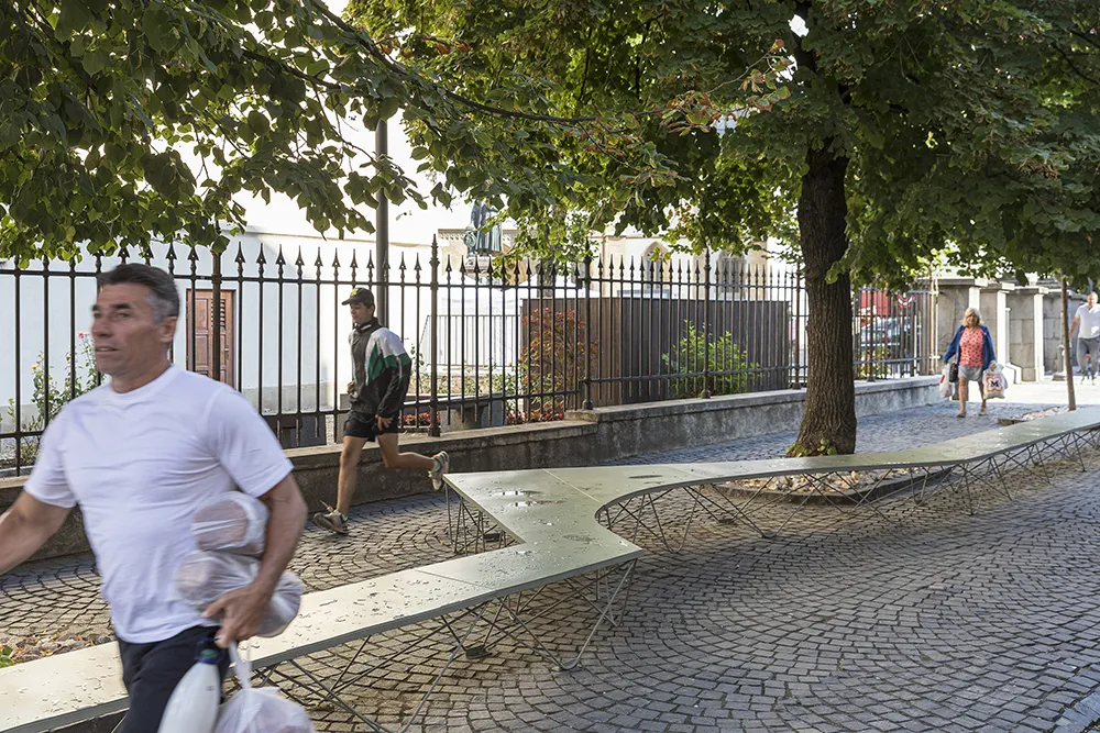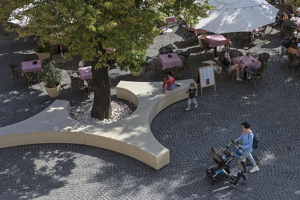 Mobilierul realizat pentru Piața Huet este un mobilier amovibil, reversibil și relocabil dar născut din condițiile specifice și de înțelegere a contextului respectiv. Sensul proiectului a fost acela de a conforma locuri și de a aduce oamenii în piață, de a schimba accepțiunea pieței urbane de astăzi, de a crea locuri unde ei să se oprească sau chiar de a face posibilă funcționarea unei piețe agroalimentare volante. Mobilierul este independent de construcții, nu impune tăierea niciunui arbore, ba chiar mai mult, face o reverență naturii intrând în dialog cu aceasta, conformând prin geometria propusă locuri la umbra copacilor. Proiectul conformeză prin geometria lui zone până la care ulterior se pot deschide posibile spații și dotări publice în Piața Huet. În gândul nostru era ideea unui gest ca o coasere a frontului construit al caselor cu spațiul pieței. Am reperat astfel zone unde am propus activități asemănătoare. Acest asemănător dar totuși nuanțat a stat la baza realizării mai multor tipuri de mobilier ce servesc scopuri diferite: bancheta „vă vedem”, băncile „zigzag” respectiv băncile „licheni”. Mobilierul din zona sediului PSD, bancheta „vă vedem”, a fost inspirat de imaginea “Lanțul Baltic” din 1989 când oamenii au făcut un lanț uman unindu-și brațele. Această referință ne-a inspirat în realizarea mobilierului lung, pus in fața clădirii, orientat frontal, asemănător demersului „vă vedem”. Băncile „zigzag”, gestul coaserii cu rol multiplu. Poziția sa delimitează zona până la care s-ar putea extinde funcțiunea publică a clădirilor de pe acea latură a pieței. Mobilierul este realizat din tolă metalică vopsită in câmp electrostatic, vopsea gri-verzui in ton pastelat pentru discreta așezare în cromatica locului. Această bancă este o “coasere” a frontului cu spațiul pieței, un zigzag printre copaci, punând în valoare natura și sugerând acest gest fluid ce înconjoară biserica. Prin acest mobilier din loc în loc pe lungimea lui se poate trece dintr-o parte în alta si el este ca o țesere a aliniamentului copacilor, țesându-se în jurul alveolelor spațiilor verzi ce sunt la baza trunchiurilor copacilor. Mobilierul nu obturează căile de circulație pietonală și auto. Băncile „licheni” sunt elemente modulare amplasate unele lângă altele conformând spații pe sub copaci. Sunt o reverență adusă naturii, geometria lor împrumutând din maniera de creștere a naturii.