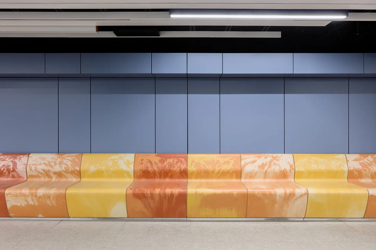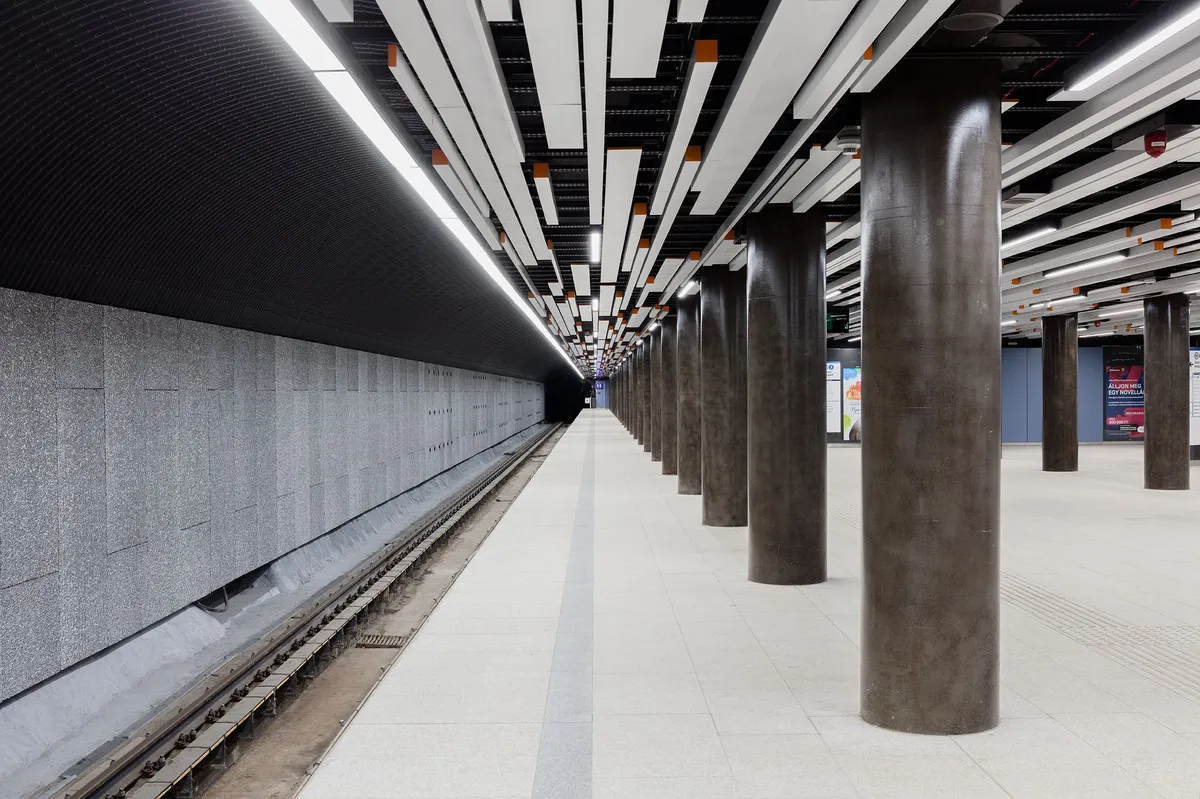 Az építészeti koncepció alapját a meglévő, összetett tartószerkezeti-műtárgy geometriához igazodó, ahhoz lazán kapcsolódó utastérhatároló burkolatok képezik. A burkolatok egymáshoz képest kitérő elemekként viselkednek, segítik az utasáramlást, befogadják az összetett funkció által megkövetelt berendezéseket és több ponton rálátást engednek a metró izgalmas alagútszerkezeteire. Az álmennyezetek a fehér színekkel, narancssárga betételemekkel és a világítótestek megmozgatásával az eredeti állomás elmosódott képeként értelmezhetők, az áttörtség és a lamellák váltakozása erőteljesen dinamizálja a tereket. A falburkolatok szalag-szerűen keretezik az utasteret, színhasználatukban a megidézik a metrókék szálcement burkolatokat, de eltérő helyzetekben a szintén jellemző narancssárga színben jelennek meg. A falburkolatok az álmennyezet dinamikáját is ellensúlyozzák.
