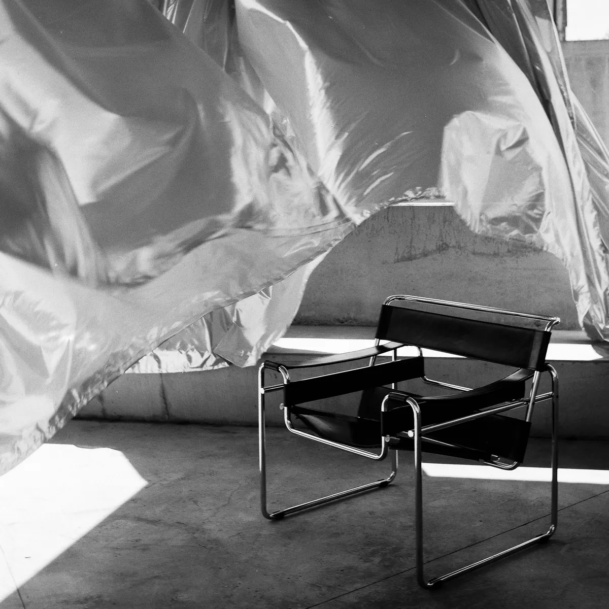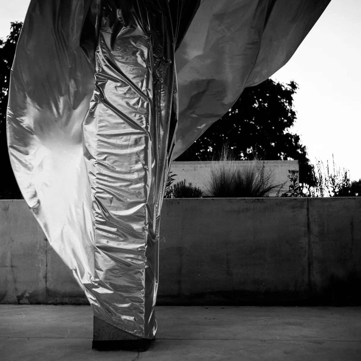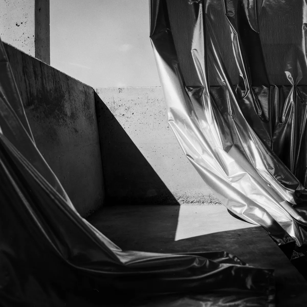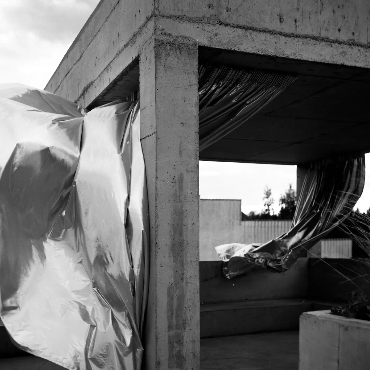 Singurul metal care se află în stare lichidă în condiții normale – mercurul - e un paradox de greutate și fluiditate care se regăsește și în materialul cu aspect greu, în textura metalică a unei draperii exterioare. Greutatea aparentă a textilului se împletește cu ușurința deformării de către o adiere de vânt. În alăturare cu betonul, greutatea metalică devine și mai fluidă prin contrast cu monolitul. Astfel, simpla acoperire a terasei unei case generează un discurs al contradicției. Iar singura metodă de a capta cu sens acest lucru a fost în sine bazată pe metal – argint / argentique. Fotografia pe film format mediu contribuie cu finețea reprezentării fidele a reflexiilor metalice.