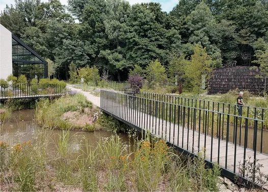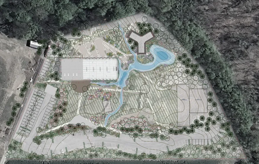 Pavilioanele sunt legate între ele de alei care se pierd în pădure și care se lățesc în anumite zone, creând suprafețe mai mari, prelungiri ale spaților interioare. Un fir de apă cu drenaj natural înconjoară de asemenea clădirile, oferind ochiuri de apă și traversări pe poduri metalice. Texturile diferite ale aleilor sunt date de dozajele diferite ale acelorași materiale: pământ, pietriș și nisip. Locurile de parcare sunt și ele ascunse în meandrele drumului, printre diverse pâlcuri de copaci plantați. În ansamblul său, proiectul peisajer combină plantațiile propuse cu natura spontană, o îmbinare care a dat roade la foarte scurt timp de la plantare.