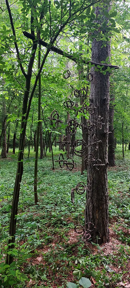 Umetnička instalacija „Snovanje“ istražuje poetiku sećanja kroz elemente i materijale kontekstualizovane kroz tradiciju, dovodeći u pitanje lična i nasleđena shvatanja o očuvanju materijalnog i nematerijalnog kulturnog nasleđa. Izbor prostora za realizaciju umetničke instalacije bitan je za autora iz više razloga, pre svega kao mesto svakodnevnog boravka, regeneracije i ličnog samopreispitivanja. S druge strane, materijal od kojeg je napravljena umetnička instalacija, opale grane vrbe, sakupljane se u okviru spomen-parka, svakodnevno, nekoliko meseci. Stoga je ideja bila da se kao odbačeni materijal vrate u prostor spomen-parka u novom obliku, što predstavlja svojevrsni proces reciklaže i kruženja materijala u prirodi. Veličina umetničke instalacije varira u odnosu na položaj elemenata u prostoru od 180-220 cm