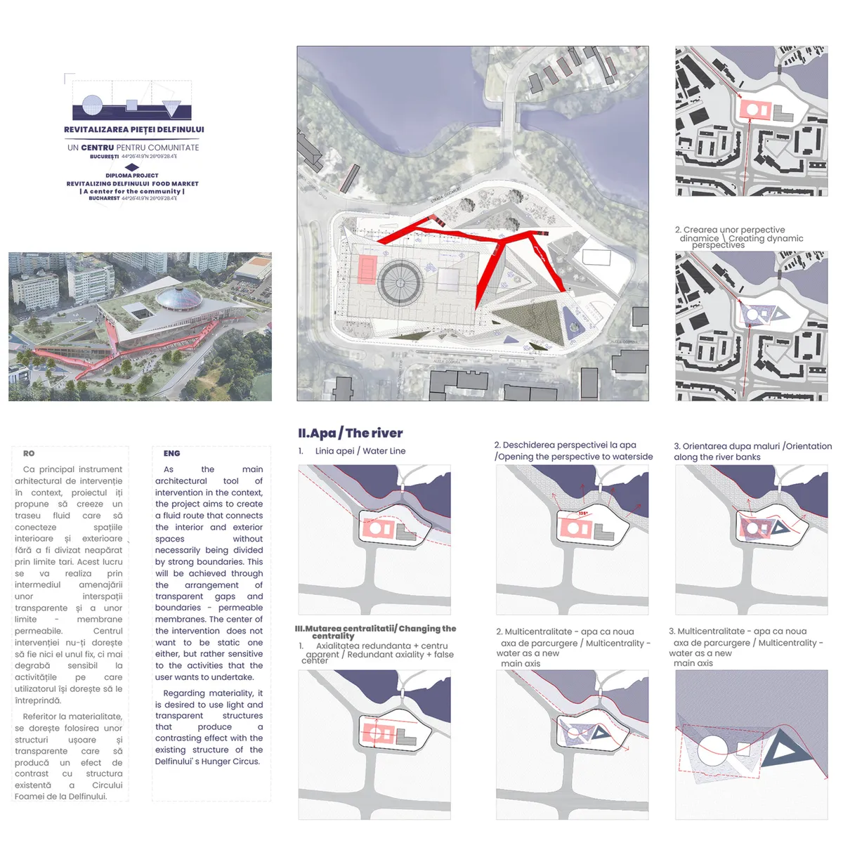 Proiectul propune scenariul coprezentei dintre structura perimata funcțional a Pieței Delfinului noul program social-cultural necesar. Utilizarea acestora pornind cu funcția de ustensil poate să genereze spații atât cu o mare încărcare emoțională prin funcția lor de rememorare, cât și cu abilitatea de a conecta noi comunități prin activitățile specifice unui program social-cultural. De asemenea, se ia in vedere modernizarea pieței agroalimentare existente și integrarea acesteia într-un traseu care conectează dotările de la nivelul amplasamentului.