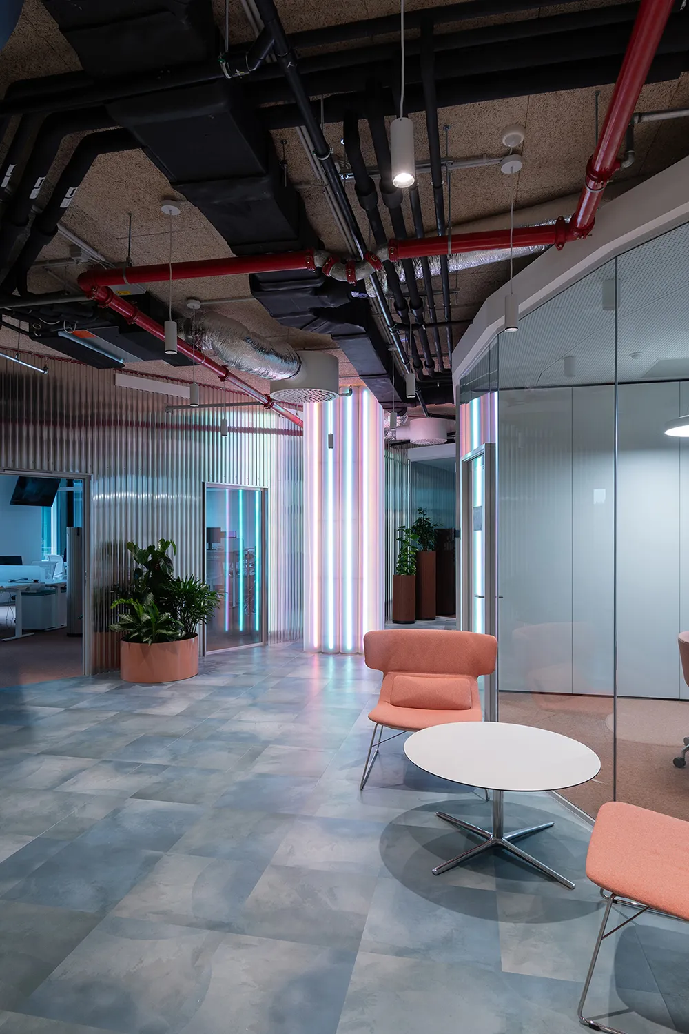 Ennek ellenére a tér bizonyos értelemben konzervatív, hiszen mindennapi munkavégzést is szolgálnia kell. Helyet kapott három cellásan kialakított igazgatói iroda, egy egybefüggő Open Office tér, négy tárgyaló, amiből a legnagyobb tovább osztható, és további, a működést biztosító kisebb terek, raktárak. Mivel mindez a megszokott funkciómix szabad geometriai elrendezésben kapott helyet, így a terv annyiban változtatott a hazai irodaépítészet bevett modelljén, hogy sokkal több átlátás jött létre benne.